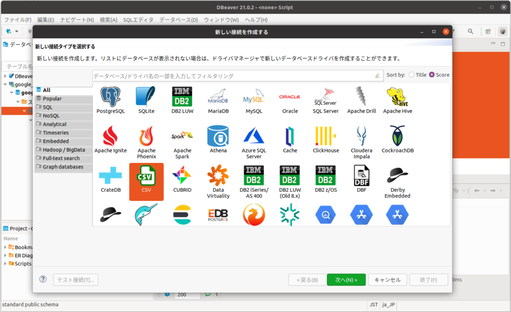 いよいよCSVのインポートです。DBeaverはCSVも格納先フォルダをデータベースとして登録してからPostgreSQLにインポートするのがお作法のようです。
