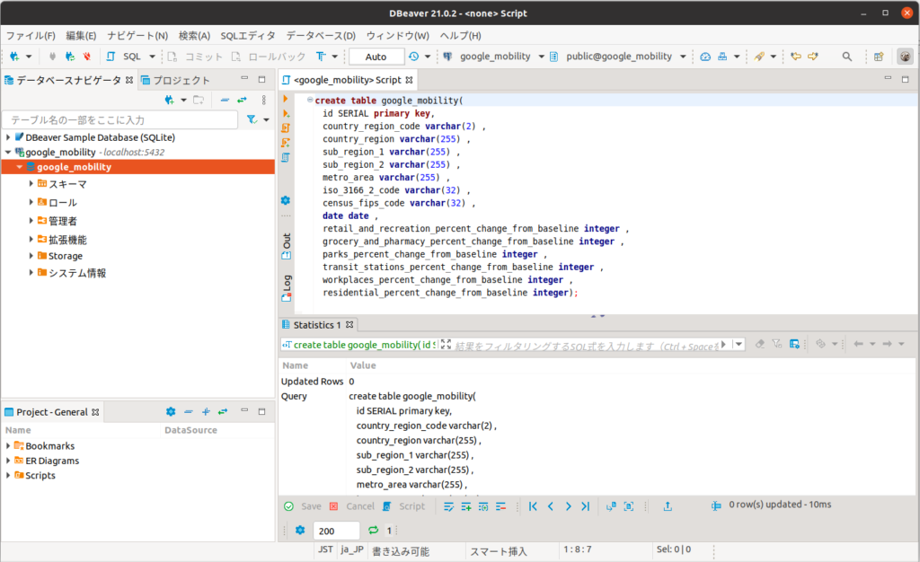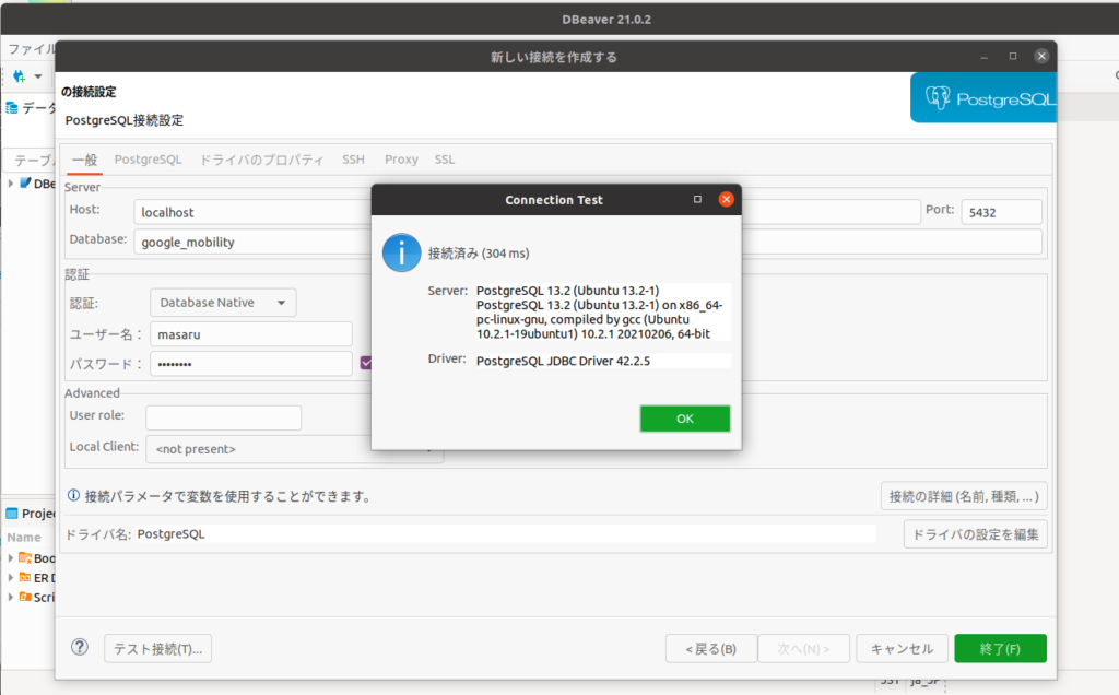 (base) masaru@ASUS-TUF-Gaming:~$ createdb google_mobilityDBeaverで接続します。