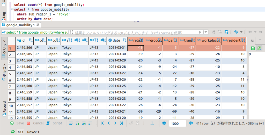 alter table google_mobility alter column place_id type varchar(32);SQL select文でデータ抽出