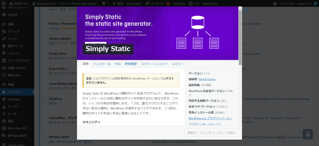 WordPressから静的サイトを生成するプラグインは複数ありますが、検索上位のSEOサイト()で紹介されているプラグインは数年間更新が無かったり有料化されてしまったダメダメなものばかりです。結局WordPress内で検索して見つけた『Simply Static』を使うことにしました。
