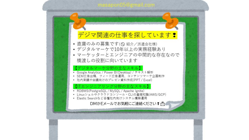 今春から長期の仕事を探しています。40代なので「採用はちょっと……」という人事ご担当者様も多いと思います。正直20代の元気な方のような伸びしろはありませんが、当サイトでスキルレベルが適切と思われた方は、お気軽にお声がけ頂ければと思います。下記フォームかツイッター(https://twitter.com/masarumkt)、あるいはメール(masapon05 アットマーク gmail.com)でご連絡下さい。