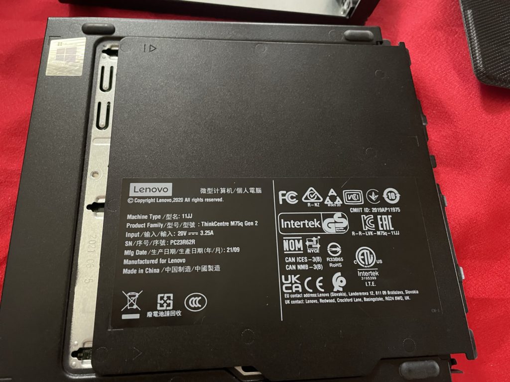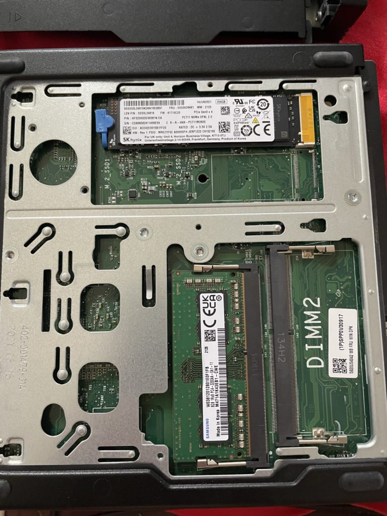 Lenovo ThinkCentre M75q Gen2の裏蓋を開くと、メモリとM.2 SSDのスロットがあります。交換を前提に最小構成で注文したので、メモリ8GB、SSD256GBとなっています。メモリは64GB、M.2 SSDはNVMe 1TBに交換しました。
