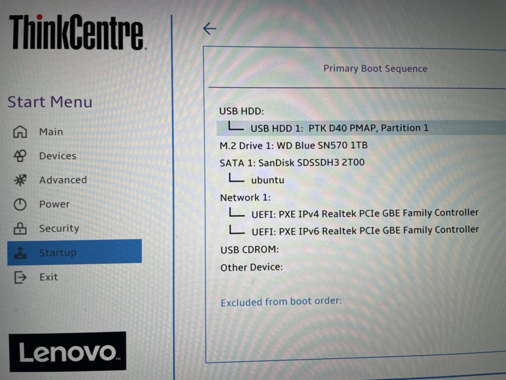 BIOS画面の『USB HDD』がUSBメモリ、『M.2 Drive 1』がM.2 SSD(WD Blue SN570 1TB)、『SATA 1』が2.5インチ SSD(SanDisk SDSSDH3 2T00)です。どちらも正しく認識しました🙌