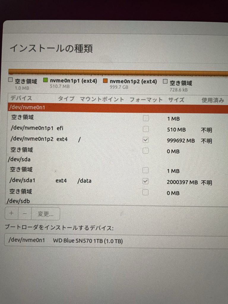 最近のPCではこれとは別に、512MB前後の『efi』パーティションを作る必要があります(無いと怒られます💦)。SATAのデータドライブ(/dev/sda)は『/data』にマウントしました(特に命名ルールはありません)。