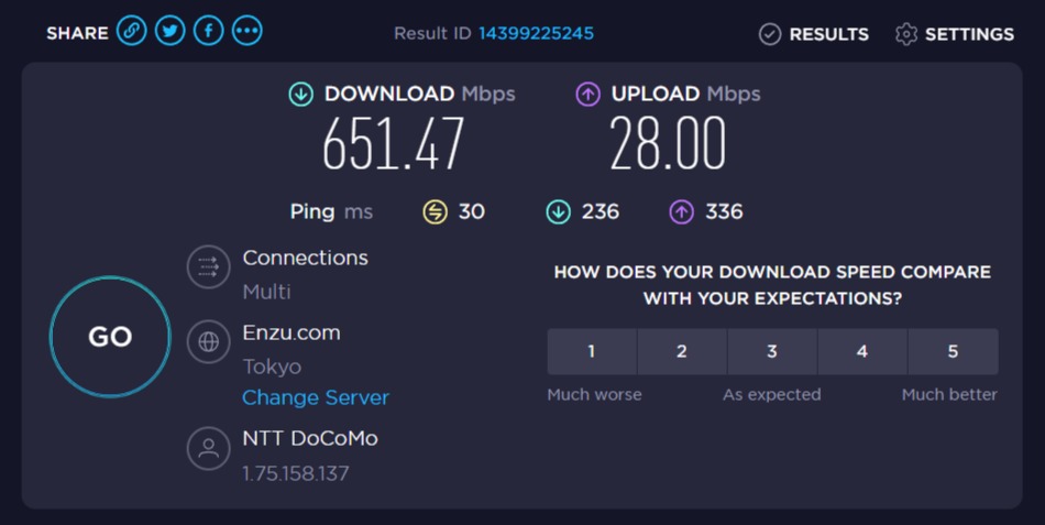 ドコモショップで利用住所変更をしてルーターの電源ON。5G通信を示す青ランプの点灯を確認し、speedtestを走らせたところ